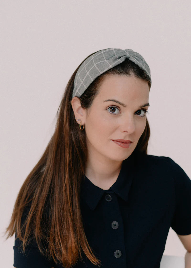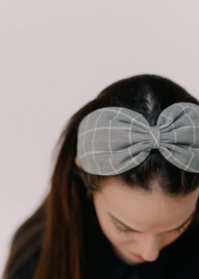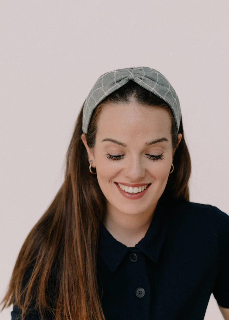 Turbante con base de diadema metálica, cosido a mano, en mi pequeño taller en Barcelona. La pieza, está realizada con tejido de algodón.