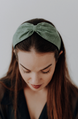 Turbante con base de diadema metálica, cosido a mano, en mi pequeño taller en Barcelona. La pieza, está realizada con tejido de algodón.