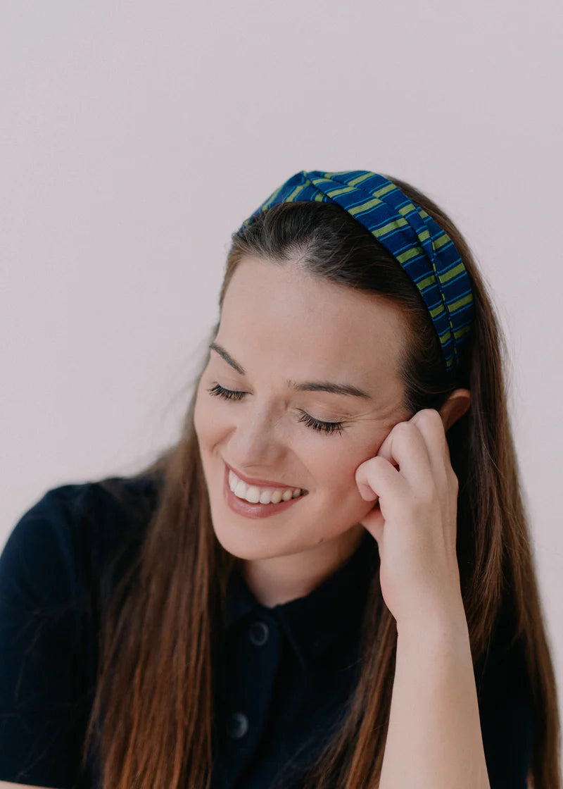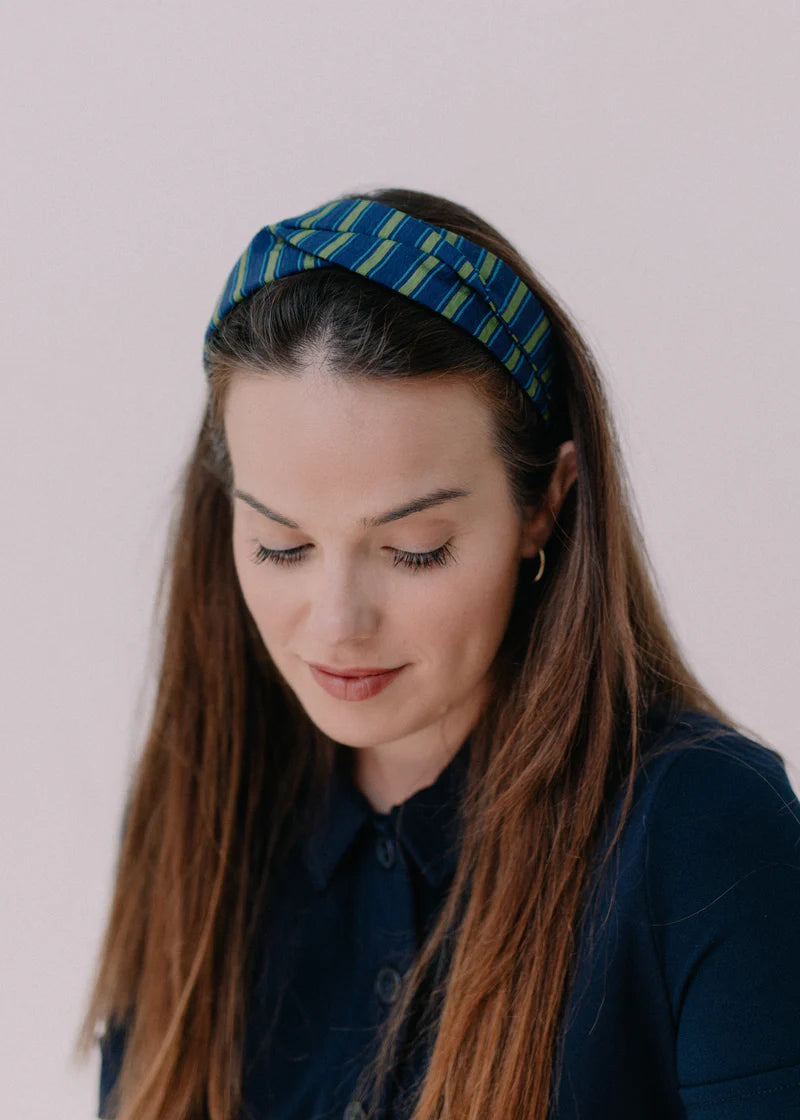 Turbante con base de diadema metálica, cosido a mano, en mi pequeño taller en Barcelona. La pieza, está realizada con tejido de algodón.