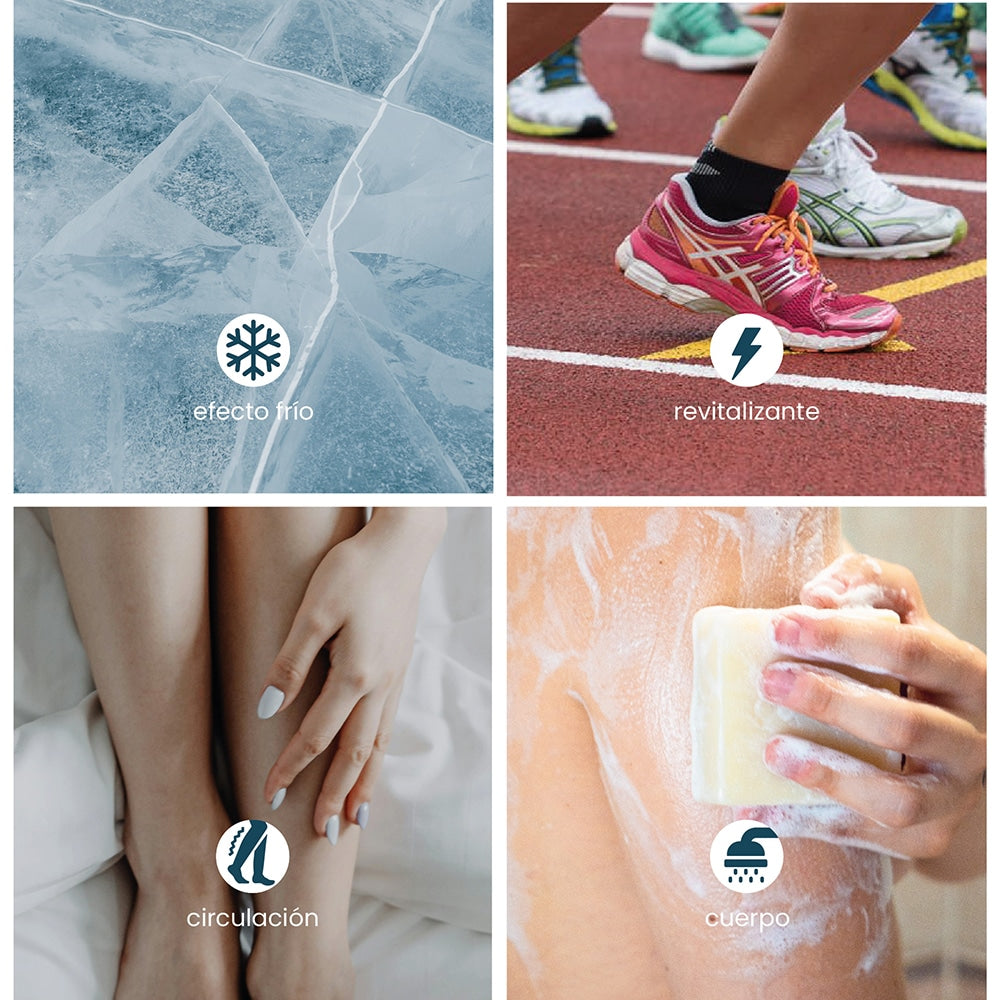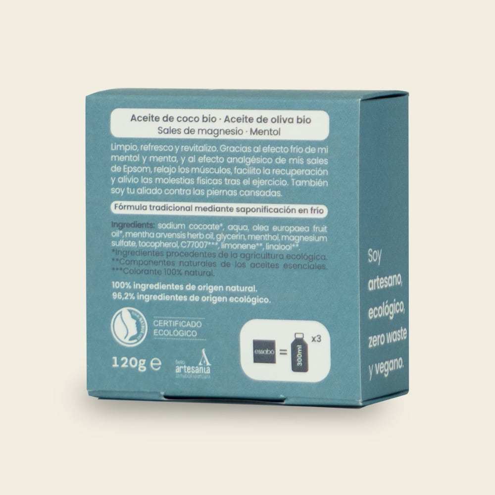 Mentol y sales de magnesio. Base de aceite de coco bio y aceite de oliva bio. Vegano.