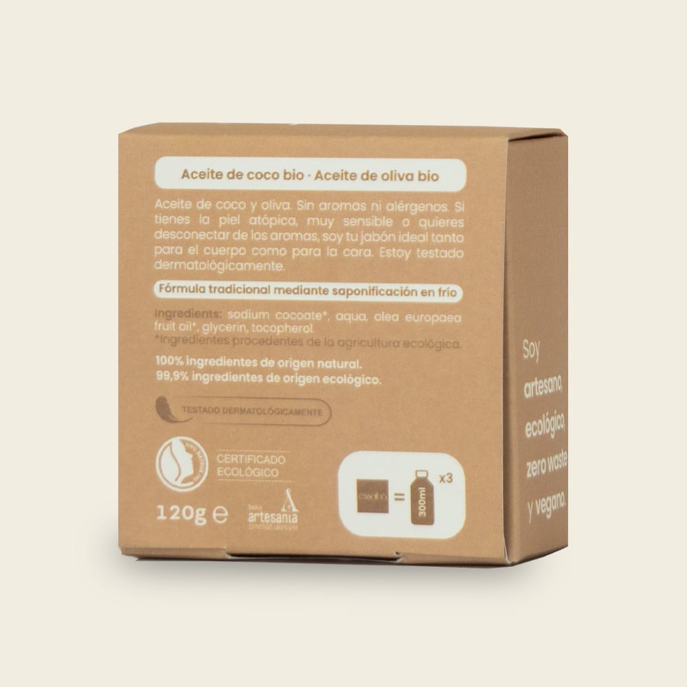 Sin perfumes ni alérgenos. Base de aceite de coco bio y aceite de oliva bio. Testado dermatológicamente. Vegano.